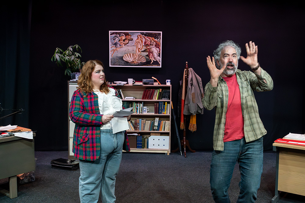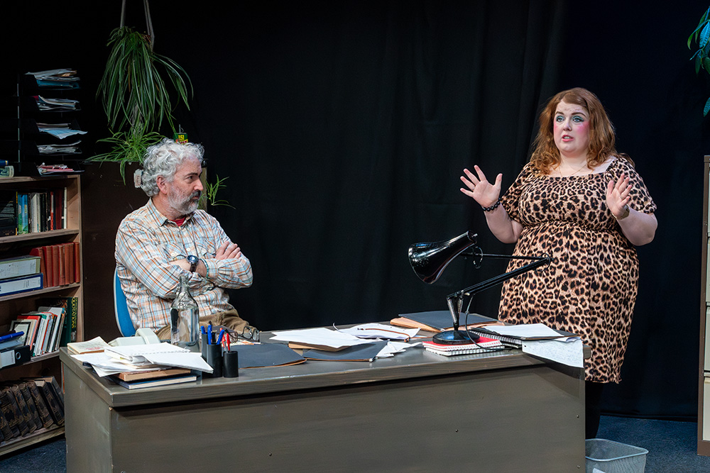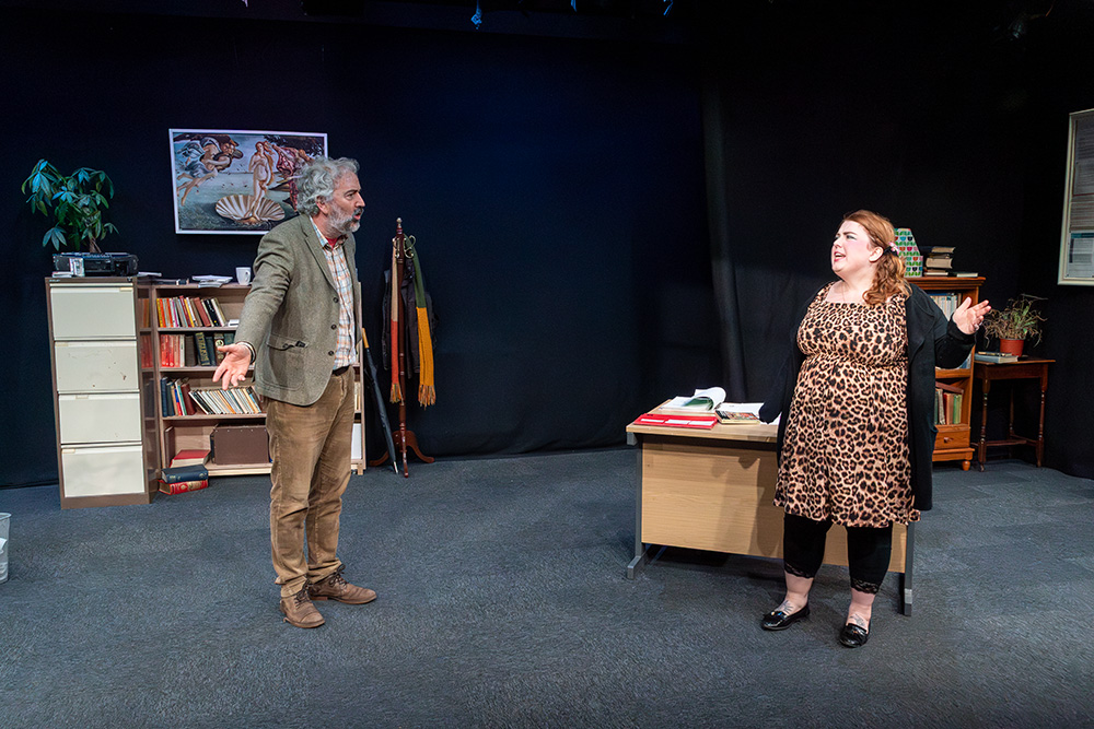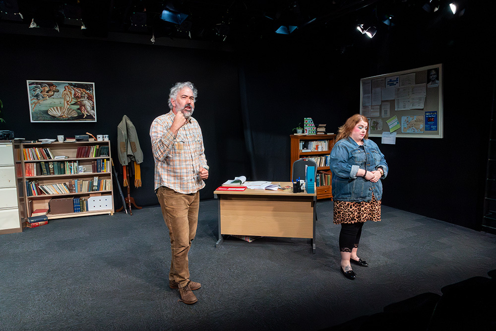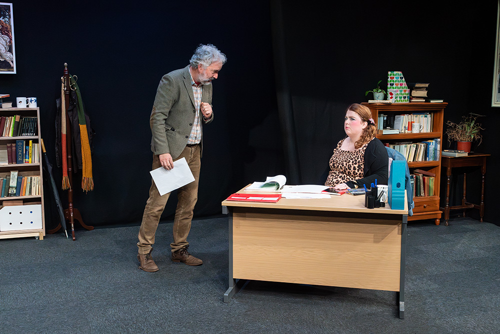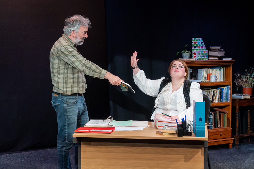 In the eponymous role of Rita, Tash Priddle puts in a delightfully endearing performance. Embarking on an Open University course in literature, Rita hopes to finally understand a world of books that presently escapes her. But there’s more going on than that; Rita is stuck in a hum-drum marriage with controlling Denny (who reacts to Rita’s interest in further education as if she’s cheating on him) and is fed up of her working class malaise, wanting to throw herself into her course and learn as much as she can, even while loathing some of the pompous reading material she encounters, finding it condescending of the working class she’s trying to escape. Tash brings a delightful quirkiness to the role; wide-eyed and optimistic, yet streetwise and giving her professor as good as she gets; Tash simply excels.