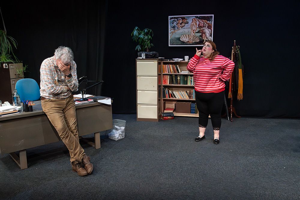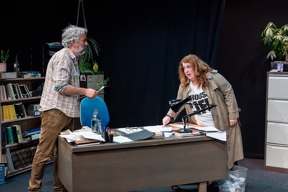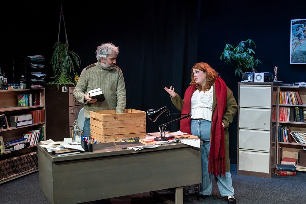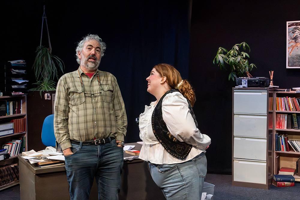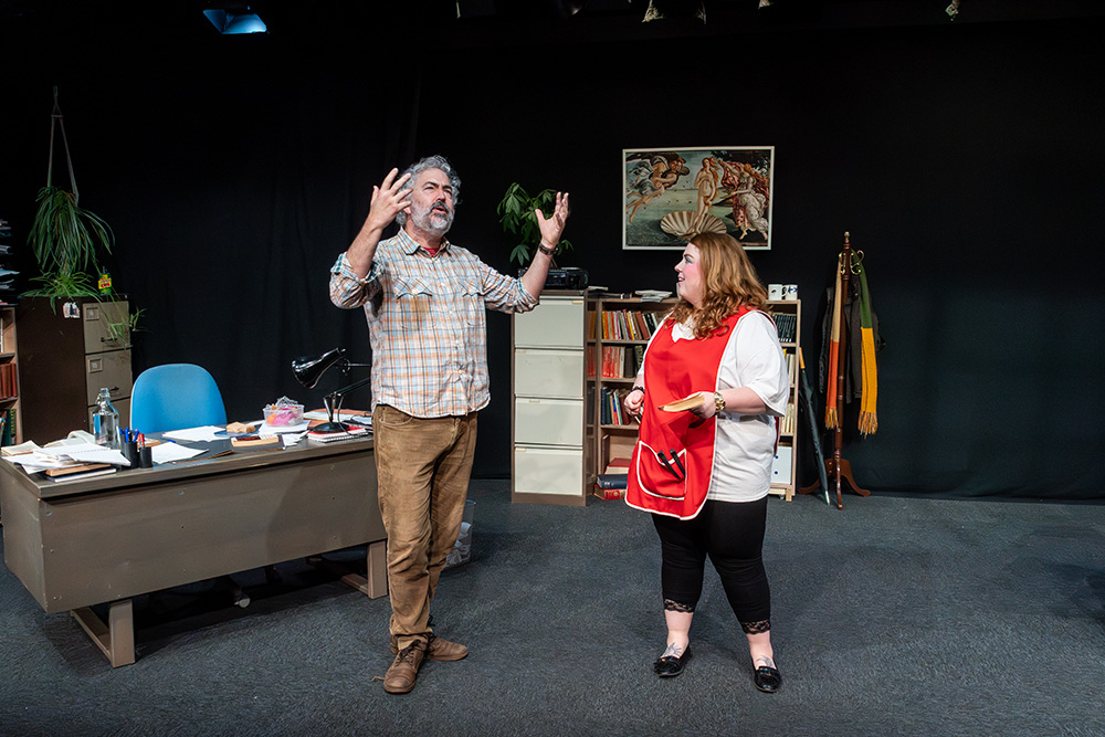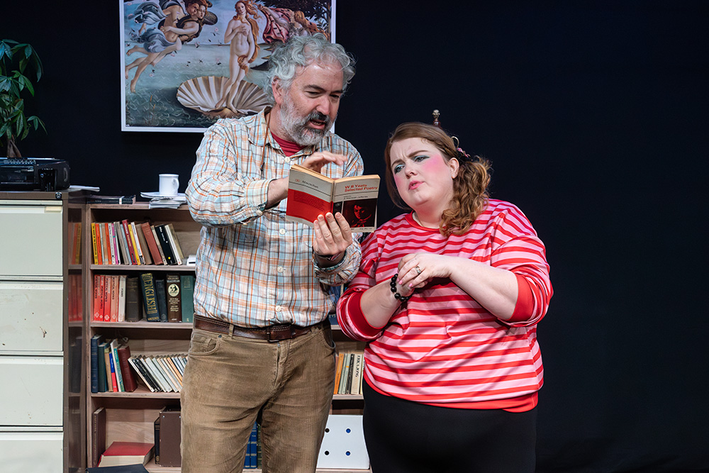 In the eponymous role of Rita, Tash Priddle puts in a delightfully endearing performance. Embarking on an Open University course in literature, Rita hopes to finally understand a world of books that presently escapes her. But there’s more going on than that; Rita is stuck in a hum-drum marriage with controlling Denny (who reacts to Rita’s interest in further education as if she’s cheating on him) and is fed up of her working class malaise, wanting to throw herself into her course and learn as much as she can, even while loathing some of the pompous reading material she encounters, finding it condescending of the working class she’s trying to escape. Tash brings a delightful quirkiness to the role; wide-eyed and optimistic, yet streetwise and giving her professor as good as she gets; Tash simply excels.