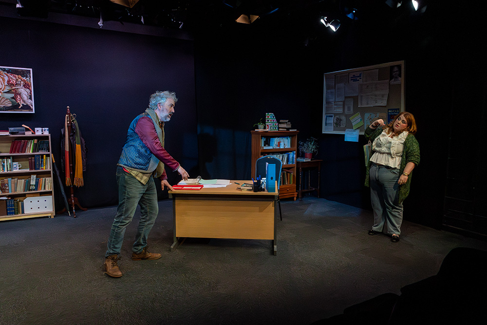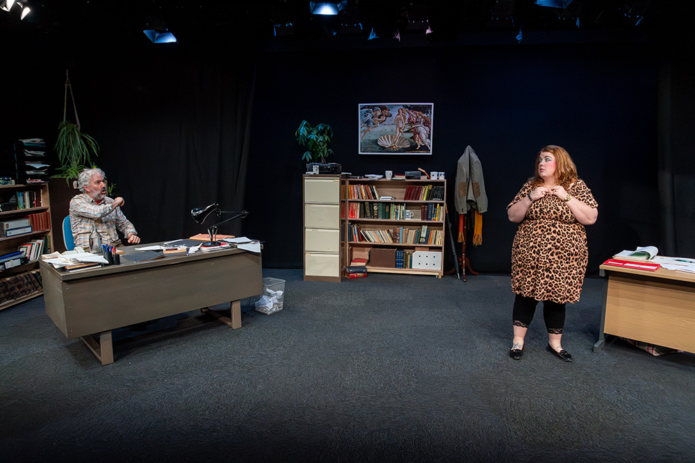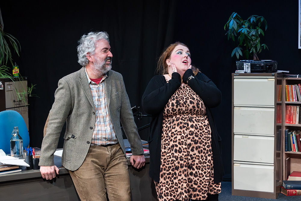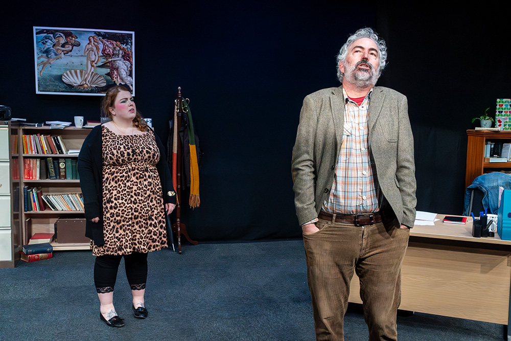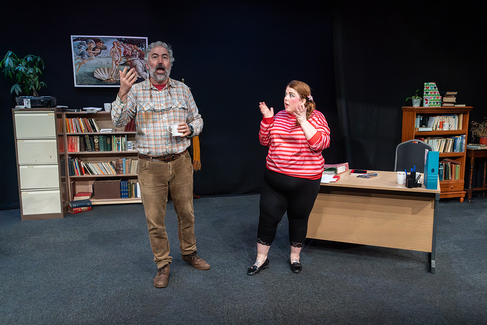 While written to be set in Russell’s native Liverpool, Maskers chose to adapt some of the dialogue to suggest a Southampton locale; this was a good choice, doing no damage to the piece at all and helping further engage the highly appreciative first night audience. The intimate Maskers studio, seating approximately 50, created an almost claustrophobic atmosphere where we could totally absorb ourselves in Frank and Rita’s shared world. The simple office set was well dressed with an assortment of books, ornaments, drinking paraphernalia and raunchy painting (or is it?), with the width between each character’s desk allowing a vast acting space, which director, Jenni Prior, and actors made excellent use of.
