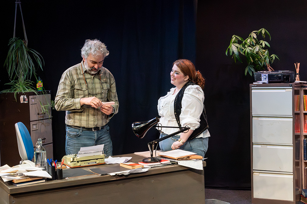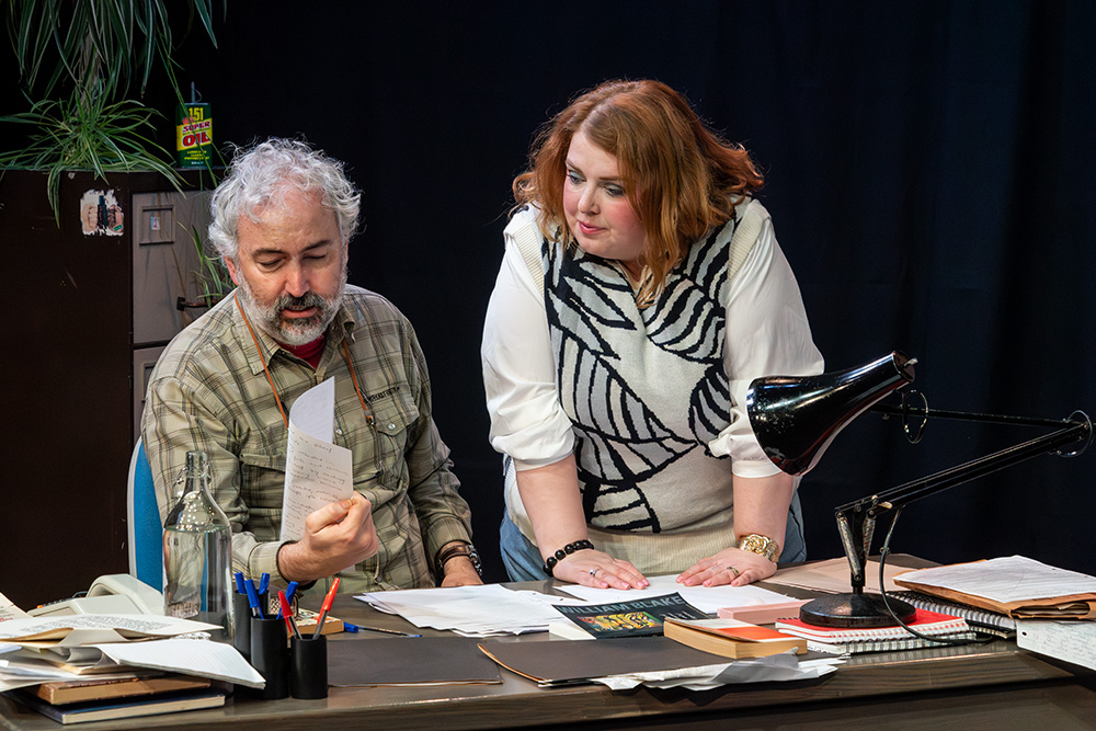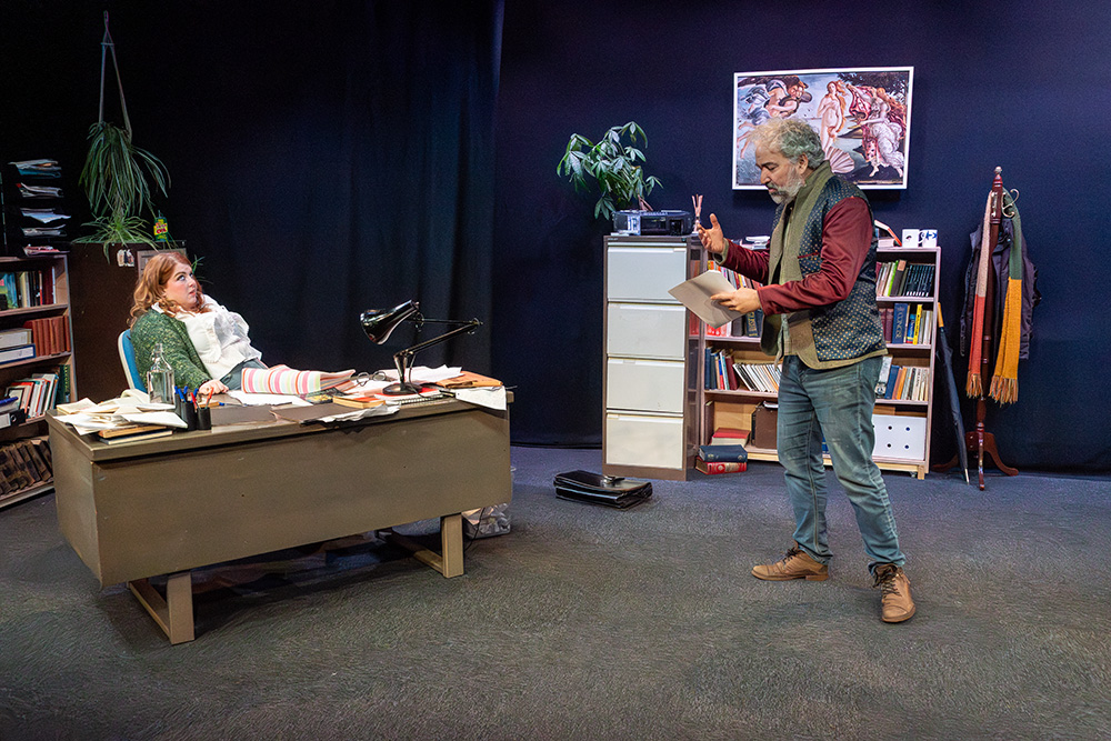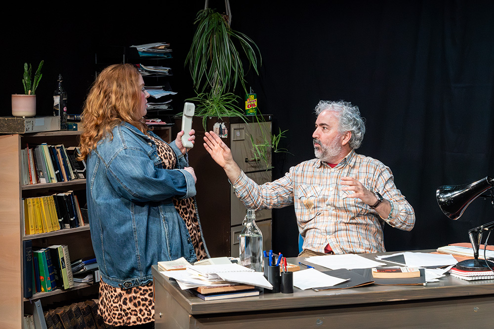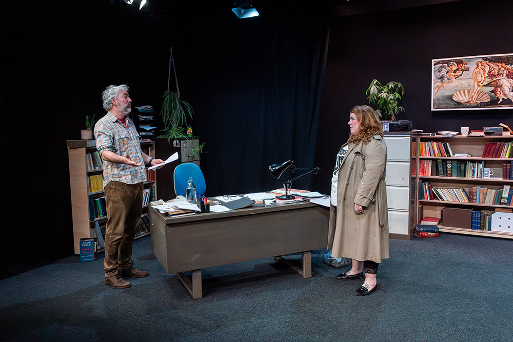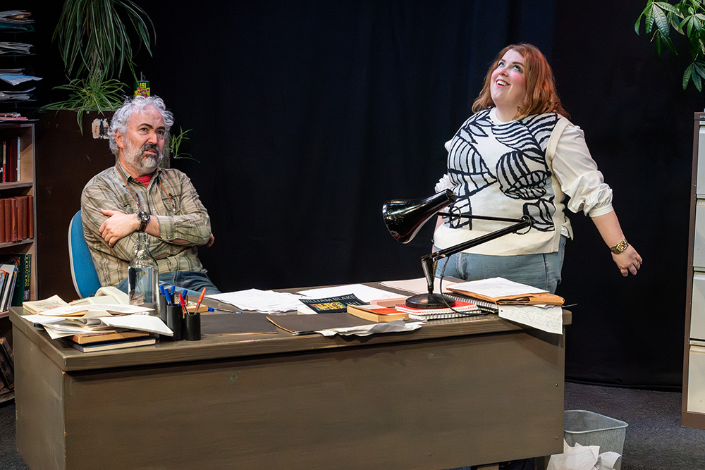 While written to be set in Russell’s native Liverpool, Maskers chose to adapt some of the dialogue to suggest a Southampton locale; this was a good choice, doing no damage to the piece at all and helping further engage the highly appreciative first night audience. The intimate Maskers studio, seating approximately 50, created an almost claustrophobic atmosphere where we could totally absorb ourselves in Frank and Rita’s shared world. The simple office set was well dressed with an assortment of books, ornaments, drinking paraphernalia and raunchy painting (or is it?), with the width between each character’s desk allowing a vast acting space, which director, Jenni Prior, and actors made excellent use of.