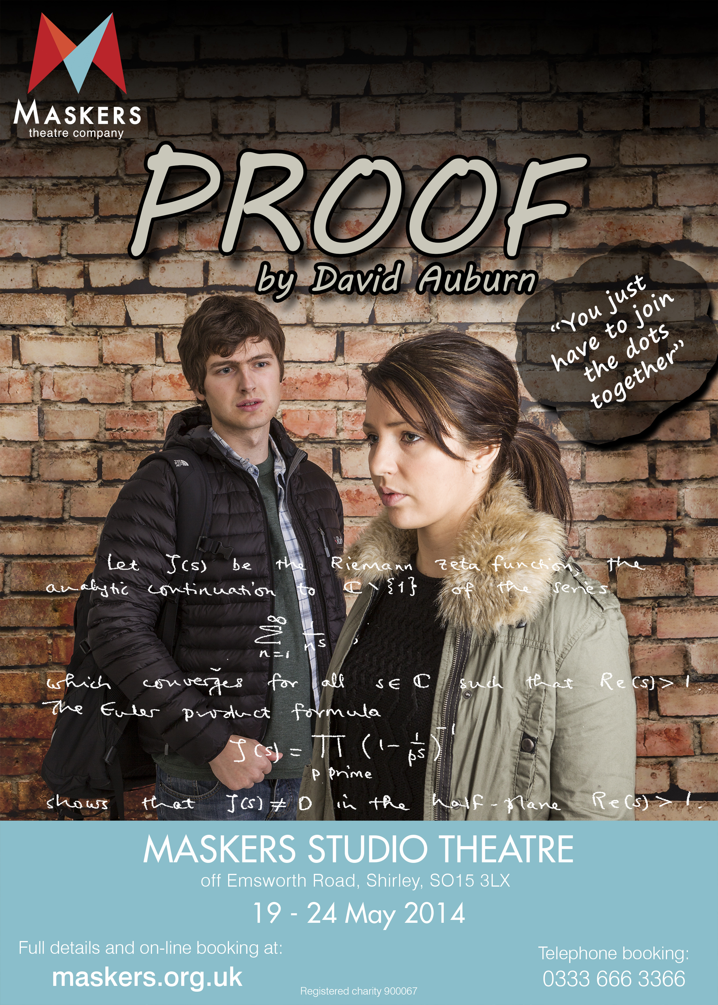 Hal is played by Rob Osborne. Rob has been with Maskers for nearly three years and has been involved with eight productions both backstage and onstage. Proof is his biggest acting role to date and he has relished the challenge of playing an awkward, drum playing, American Maths Geek. He would like to thank the director, cast and crew for supporting him all the way and for giving him at least a vague understanding of Germain Primes and nonlinear operator theory. |