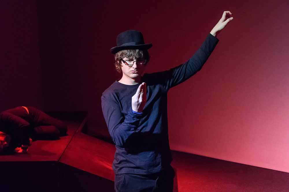 As you enter the studio, immediately you notice seven of the cast already assembled on the tiny acting space. Four identically black-clad characters sit immobile on stools, two stand behind them, one bowler-hatted, but to the left of the space on a slightly raised platform lies another figure, face downwards, half-crouched. For several minutes, five or more, they remain staring straight ahead as the audience assembles. The atmosphere is already tense and exciting and the choreography as the actors start to move mechanically absolutely brilliant in its precision. This high standard of mime is maintained throughout the production, surely thanks to a scrupulous director who knows just what she wants.