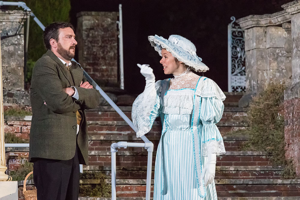 Pygmalion, George Bernard Shaw’s original story of Cockney flower girl-made-posh and the source and inspiration for its better known musical counterpart My Fair Lady, is a little bit of a strange choice for a grand outdoor performance; it is quite wordy, has many two/three handed scenes, is fairly static and is set mainly indoors. It also relies on facial expressions (especially Eliza’s) which are lost at any distance. So it’s a shame in a way that the beautiful, and huge, setting at Hamptworth is under-utilised for this piece.