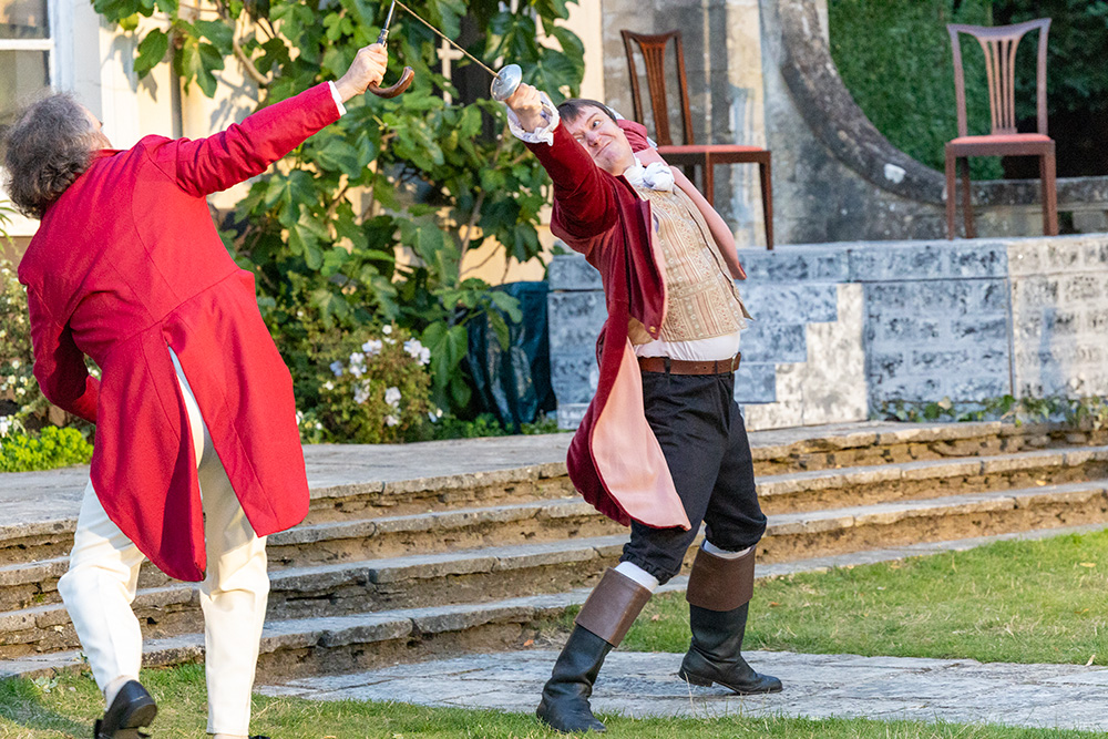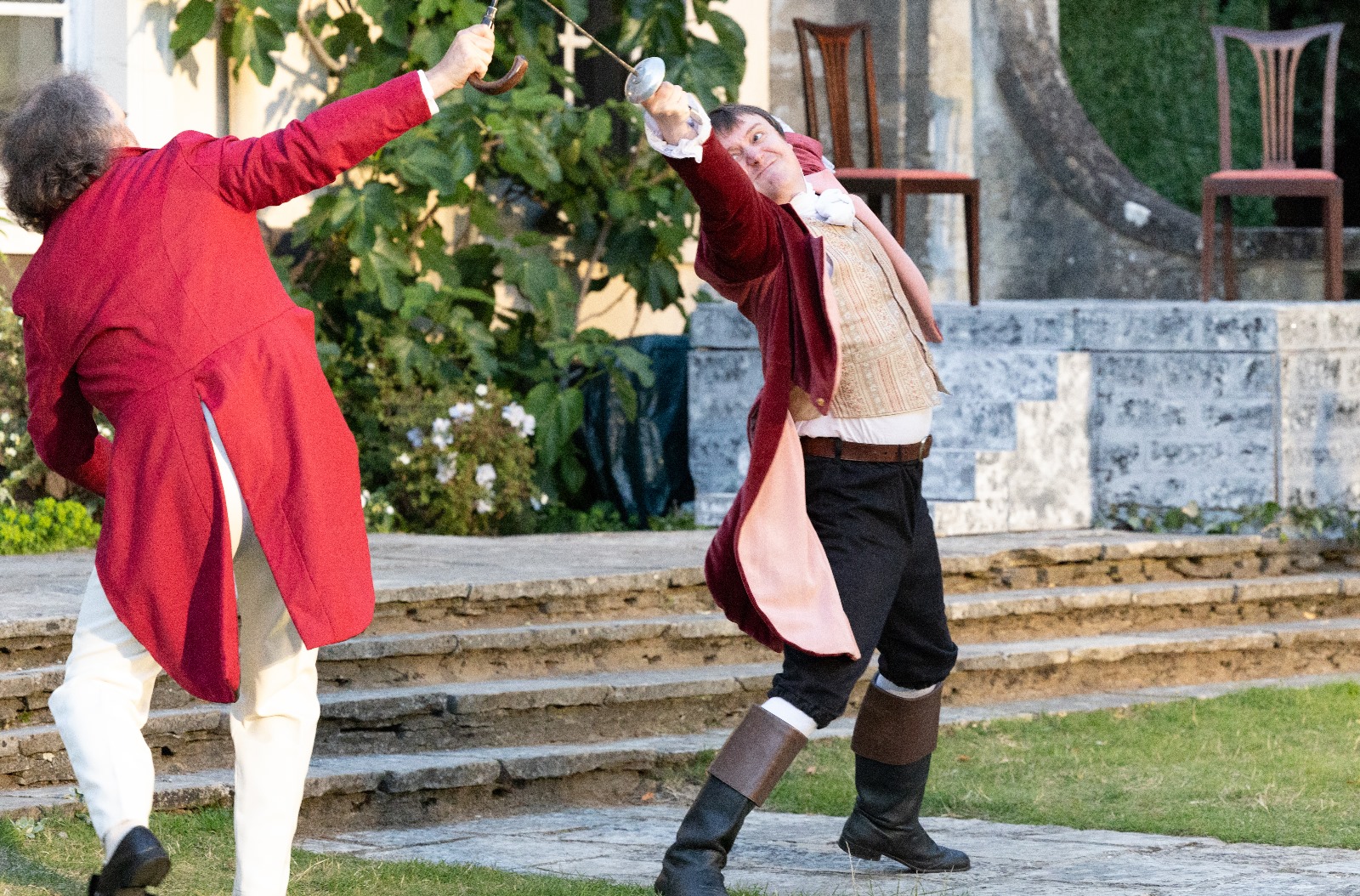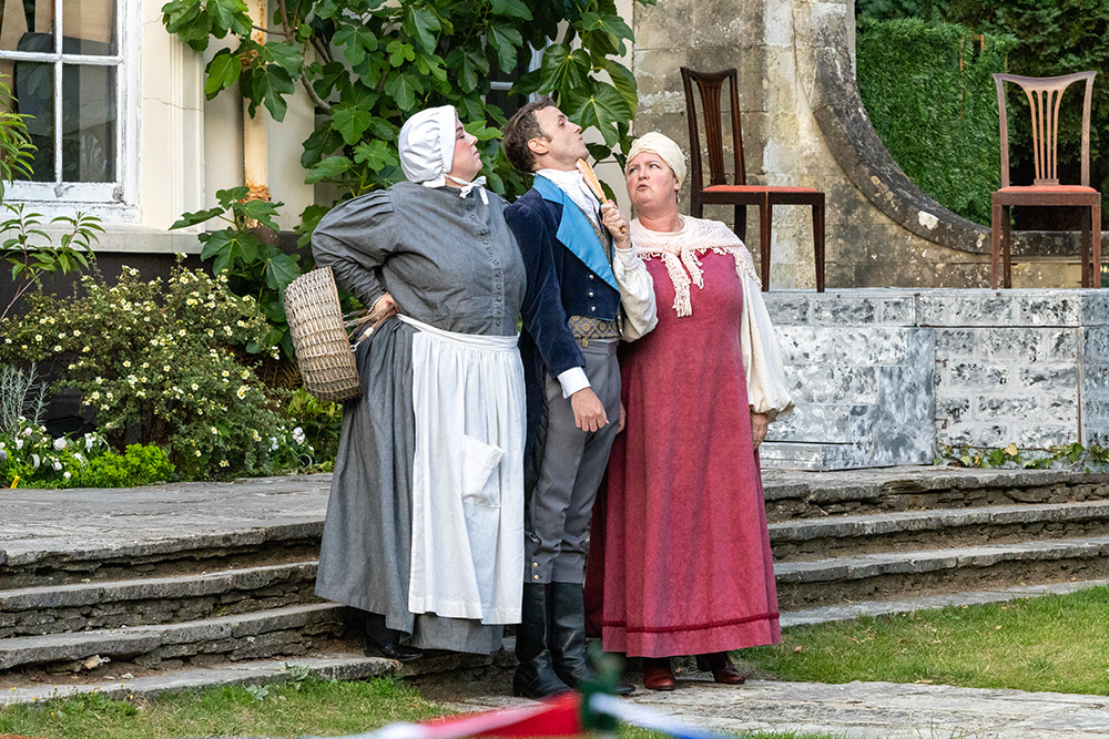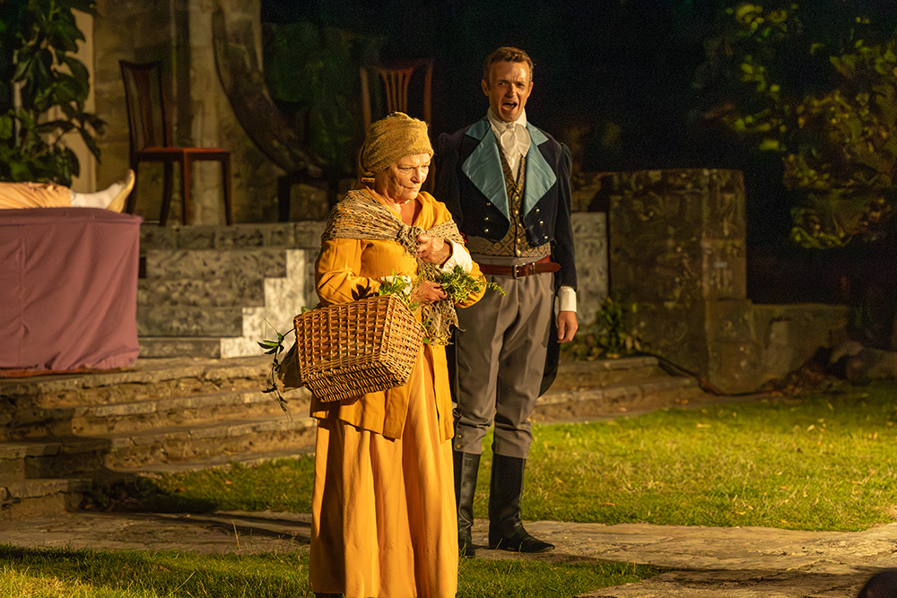 Normally utilising the larger, western side of the beautiful Georgian Townhill Park House (ironically remodelled in Italian style in the early part of the 20th century), this latest show has moved location to the other side of the house where a more intimate setting with its slightly raised terrace lends itself to be the Verona home of the Capulets, aided by a couple of set constructions to represent Juliet’s sleeping quarters (and that famous balcony) and her family’s drawing room. Entrances and exits are accomplished by at least four different routes, including the main house entrance itself, and the distances involved are controllable to ensure no delays in arriving on stage.