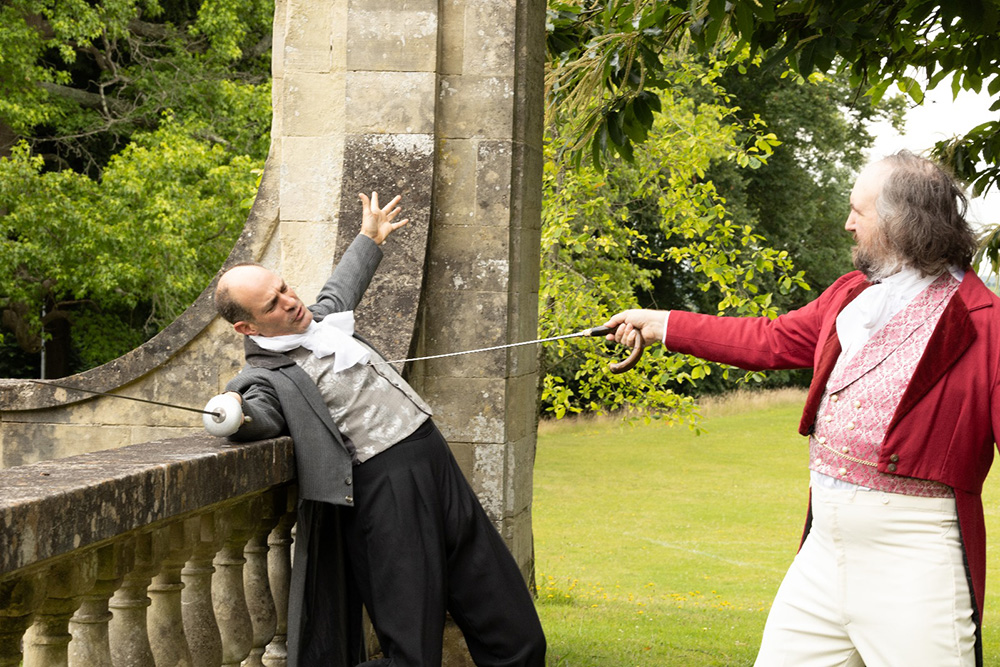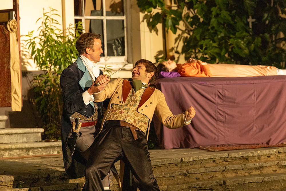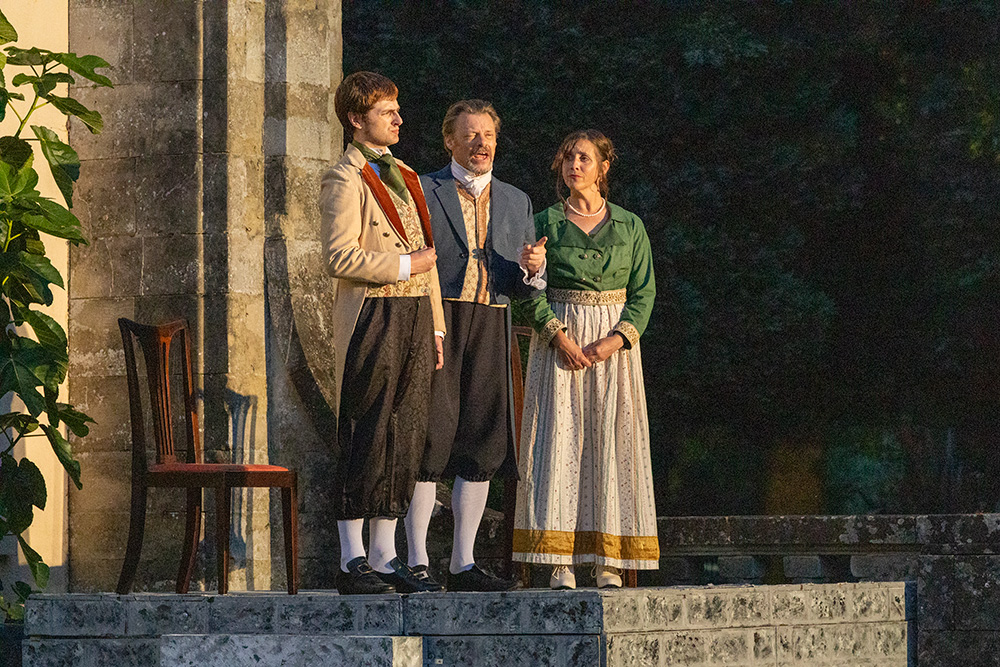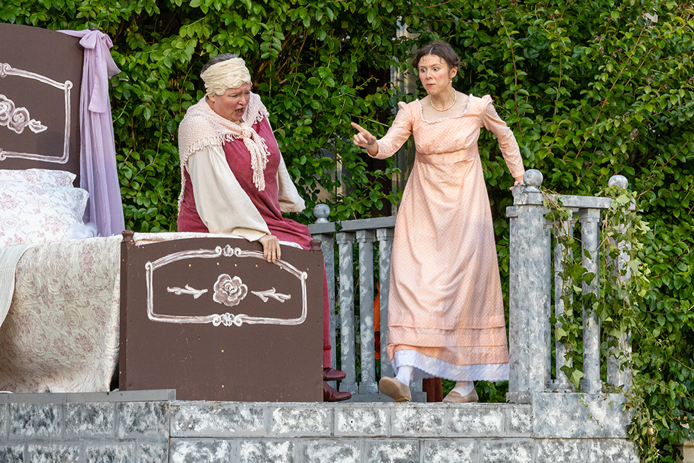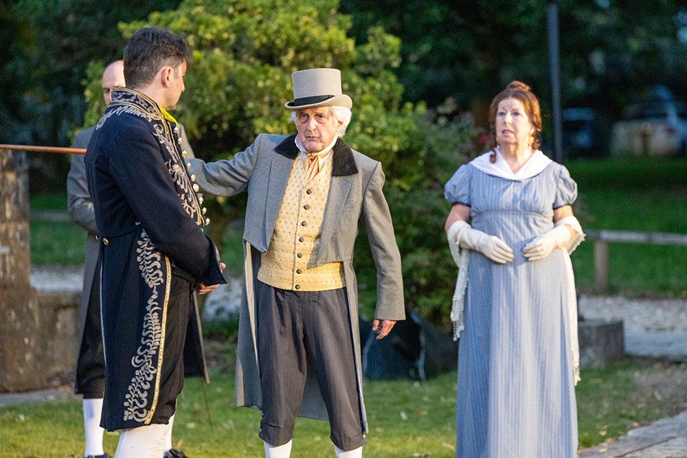 Normally utilising the larger, western side of the beautiful Georgian Townhill Park House (ironically remodelled in Italian style in the early part of the 20th century), this latest show has moved location to the other side of the house where a more intimate setting with its slightly raised terrace lends itself to be the Verona home of the Capulets, aided by a couple of set constructions to represent Juliet’s sleeping quarters (and that famous balcony) and her family’s drawing room. Entrances and exits are accomplished by at least four different routes, including the main house entrance itself, and the distances involved are controllable to ensure no delays in arriving on stage.