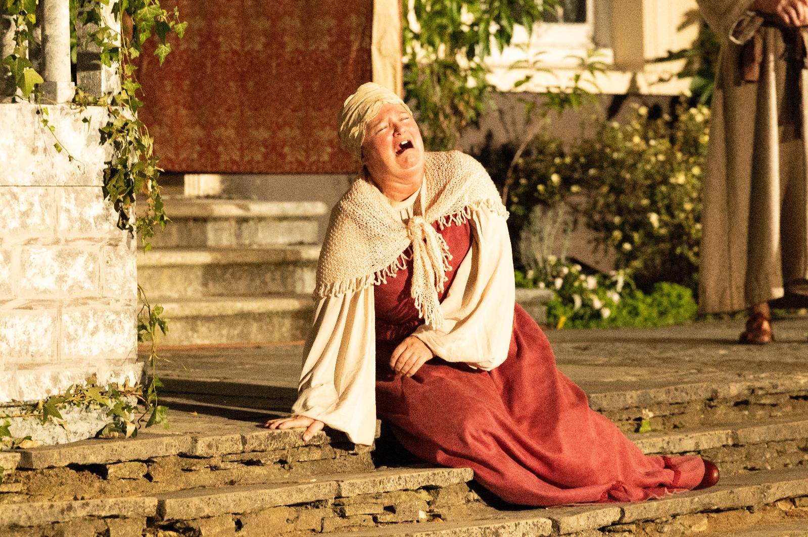 Maskers main challenge is performing the show in the open. Performing outside brings its own sets of issues, many of which were outside of Maskers control but do affect the overall experience. Whilst the weather held out for my performance, I can only imagine the difficulties faced if it hadn’t. The venue itself does not have step or raised seating, therefore unless you are early enough to nab the front row, or exceedingly tall, it is easy to miss some of the action on the ground levels of the stage. This was most noticeable in the second act finale during the infamous death scene of the title characters. This was set on the middle level of the stage but naturally the actors are sat or lying down which meant a lot of this went unseen by many audience members who were further back. The cast valiantly vocally projected to the best of their ability but some of the dialogue was lost to the noises of nature, such as chirping birds and the wind blowing through the trees. And sometimes by not so natural noises like revving car engines or, when every 25 minutes or so, a Boeing flew overhead from the nearby airport. I will say that the cast handled this very well and some well-timed dramatic pauses in their monologues meant that more was saved than lost. Short of shutting down an entire airport somehow, what could they really do aside from having microphones? Although useful in helping with projection, this idea may deviate too far from the traditional.