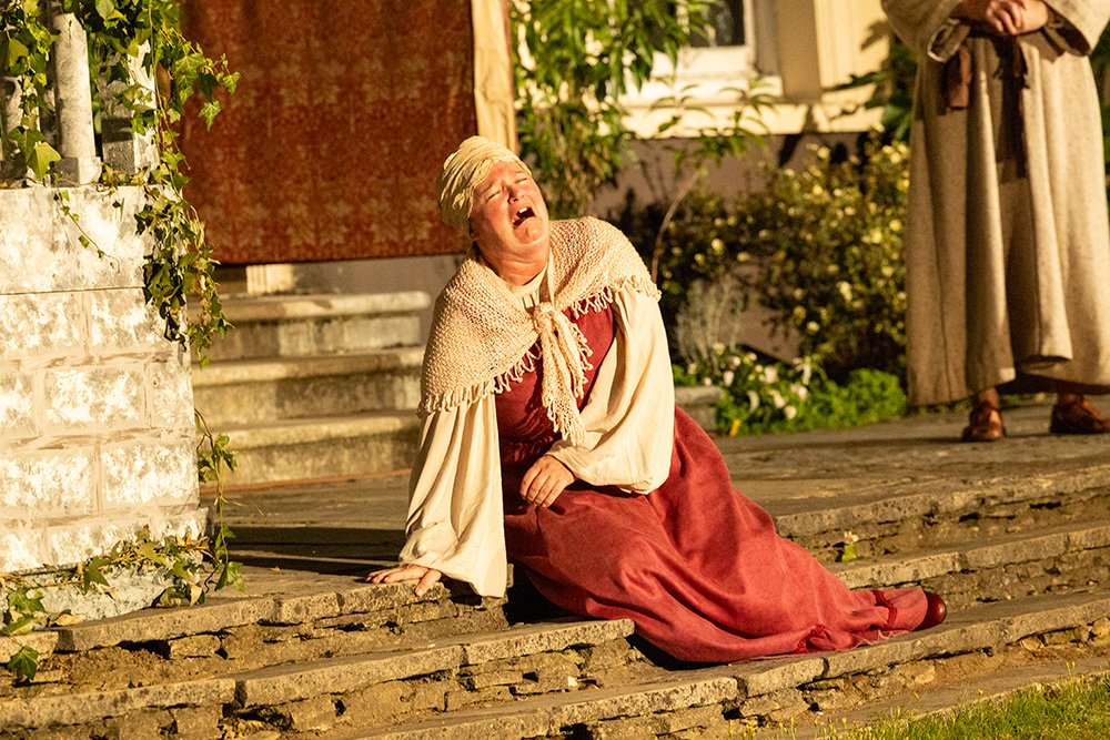 Diction is good and every word, whether Shakespeare’s vocabulary and style is fully understood or not, and is delivered with confidence and sufficient volume to be heard, even in the quieter scenes. With open air acting, it is imperative to keep the volume up (without being shouty) and projected straight out to the audience; one or two of the cast occasionally dip their heads or turn to talk to the recipient at which point the speech can become difficult to hear clearly. But overall the delivery is superb and the director should be very proud of his team.