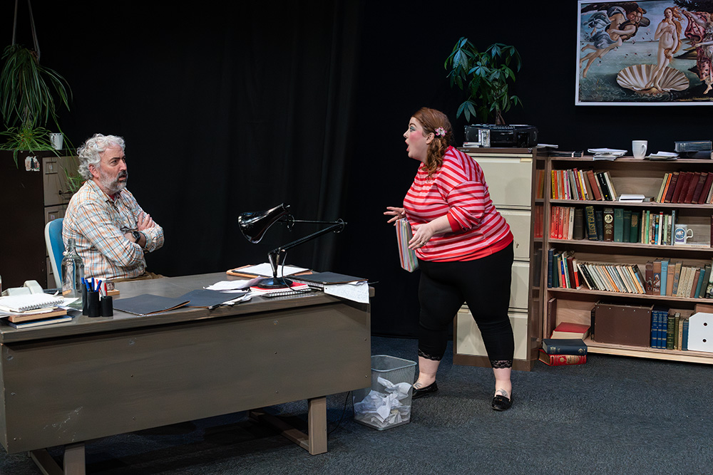 While written to be set in Russell’s native Liverpool, Maskers chose to adapt some of the dialogue to suggest a Southampton locale; this was a good choice, doing no damage to the piece at all and helping further engage the highly appreciative first night audience. The intimate Maskers studio, seating approximately 50, created an almost claustrophobic atmosphere where we could totally absorb ourselves in Frank and Rita’s shared world. The simple office set was well dressed with an assortment of books, ornaments, drinking paraphernalia and raunchy painting (or is it?), with the width between each character’s desk allowing a vast acting space, which director, Jenni Prior, and actors made excellent use of.