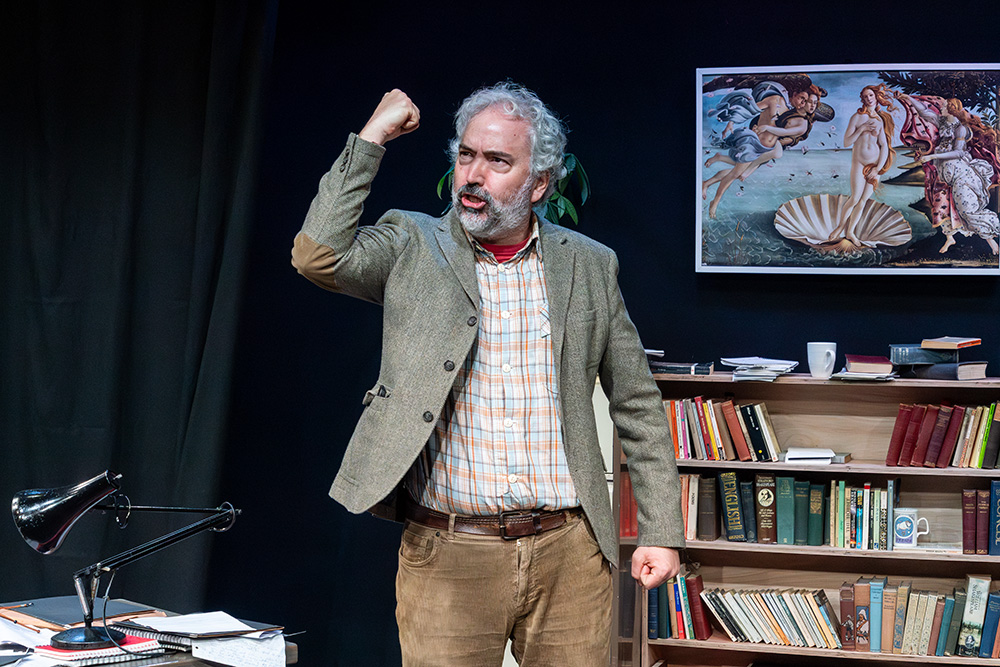 Frank, the Professor, is one of the great roles in English theatre, and Ruben Sanchez-Garcia more than rises to the occasion. A brilliant but self-deprecating poet who can’t handle praise; a divorcee who’d rather be at the pub than enjoy time with his new partner; a functioning alcoholic who hides his bottles behind books on the shelf, keeping his job as long as he “doesn’t display the signs” of his addiction; Ruben brings all these character traits to life wonderfully in a performance that is truly captivating and, I expect, would impress even the author himself. Perhaps Ruben’s hardest job is conveying the loss Frank feels as Rita “outgrows” him, as she becomes more educated, masters critical analysis and develops a wider circle of bohemian friends. Ruben displays the anger and sadness associated with this loss of control superbly without overplaying it, and his tour-de-force in playing drunk is one of the highlights of the evening.
